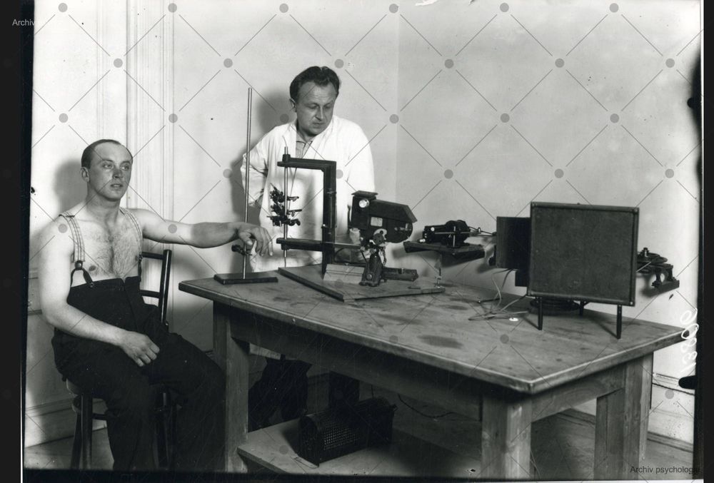 1931 (8.9.) - Psychotechnický ústav Masarykovy akademie práce, pacient při vyšetření světelného rozkladu svalovoého pohybu