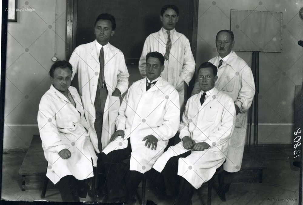 1931 (8.9.) - Psychotechnický ústav Masarykovy akademie práce, skupina vědeckých a technických pracovníků, dole zleva dr. Bena, prof. Šeracký, dr. Ivanov, nahoře zleva ing. Mayer, p. Vodička, p. Blažek