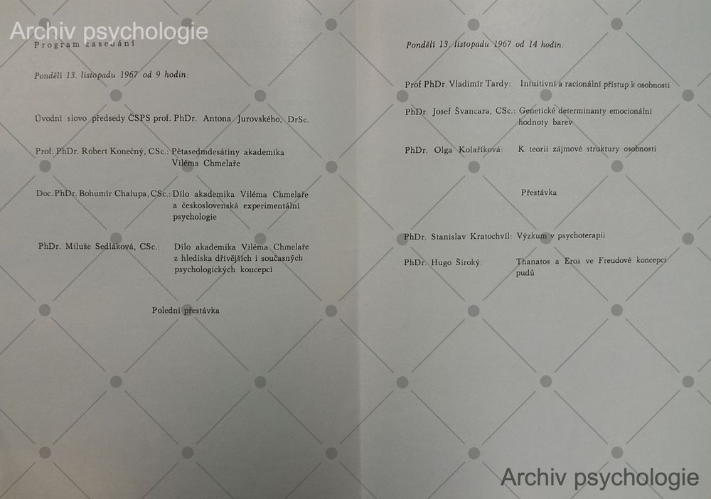 1967, Brno, Pracovní zasedání k poctě 75. narozenin prof. Viléma Chmelaře - 13. program zasedání