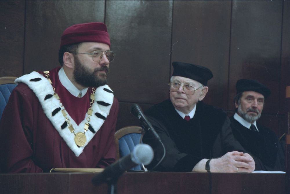 1999, Brno, Čestný doktorát MU Josefu Brožkovi - 2. Josef Brožek uprostřed mezi rektorem MU Jiřím Zlatuškou a Stanislavem Vepřekem
