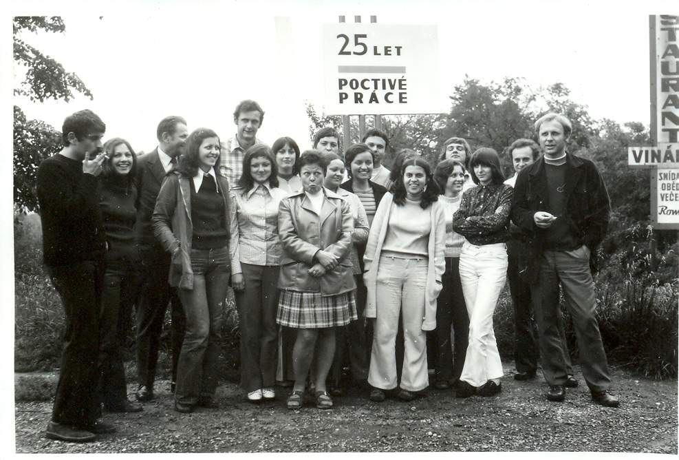 17. 1974 Studenti a vyučující na brigádě. Vlevo Lubomír Smékal, Emil Pejhovský, vpravo Zdeněk Vtípil, uprostřed Alena Jochmanová, vlevo od ní Alena Petrová