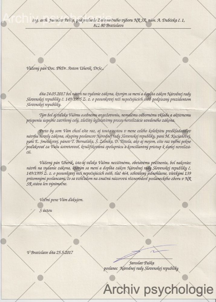 Poděkování za pomoc při přípravě zákona o posunkové řeči neslyšících (2017)