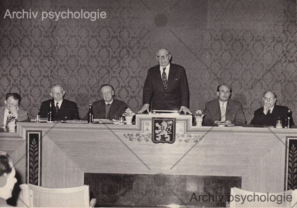 1958, Praha, Ustavující valné shromáždění ČSPS - 17. ukončení - Josef Linhart, Vilém Chmelař, Jan Doležal, Václav Příhoda, Anton Jurovský, Vladimír Tardy