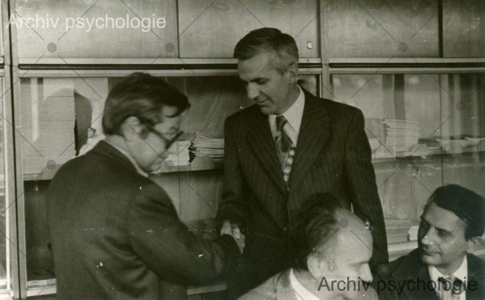 1982, Bratislava, Ústav experimentálnej psychológie - Michal Stríženec padesátiletý, na snímku rovněž Damián Kováč, Jozef Daniel a Ivan Šípoš