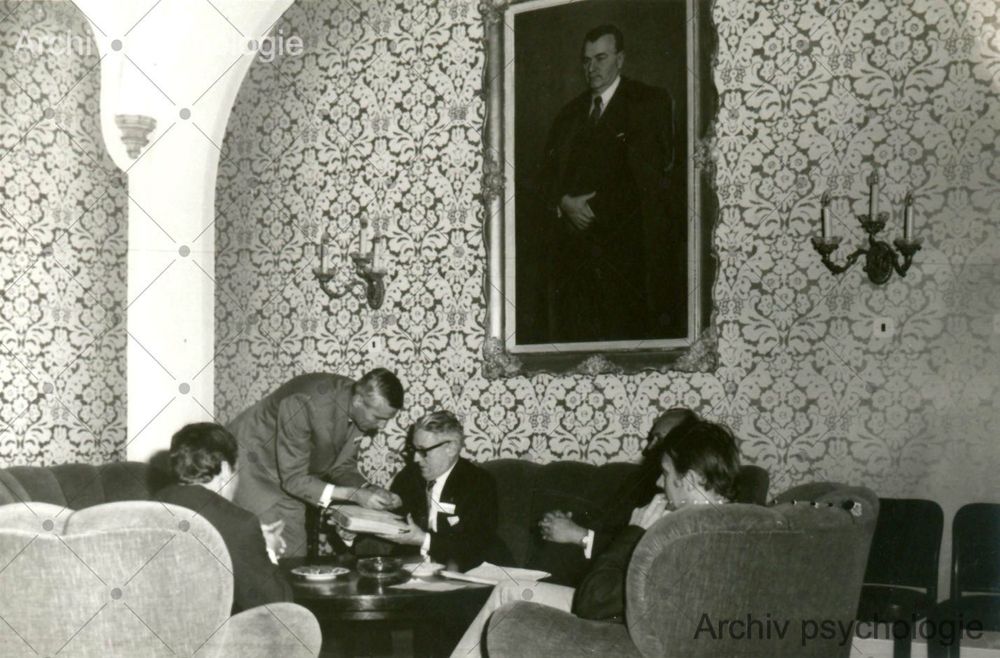 1973, Smolenice, III. stretnutie psychológov podunajských krajín - Michal Stríženec se sklání nad prezidentem IUPsyS, prof. Josephem Nuttinem, pod obrazem komunistického prezidenta